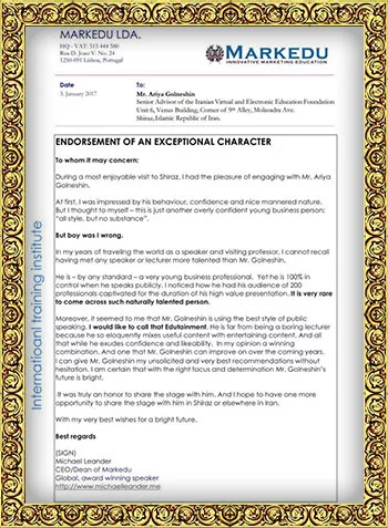 متن نامه تشکر از بنیاد آموزش مجازی ایرانیان به مناسبت برگزاری بزرگترین سمینار شیوه های نوین بازاریابی و فروش در مرداد ماه ۱۳۹۵ – شیراز
